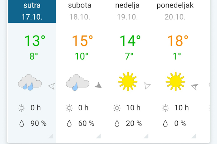 Prema izgledima vremena u Srbiji za narednih sedam dana, do 23. oktobra, u petak će biti oblačno, a kiša će se sa jugozapada i juga Srbije do kraja dana i u toku noći ka suboti proširiti i na većinu ostalih krajeva, dok će se u većem delu Vojvodine zadržati suvo.