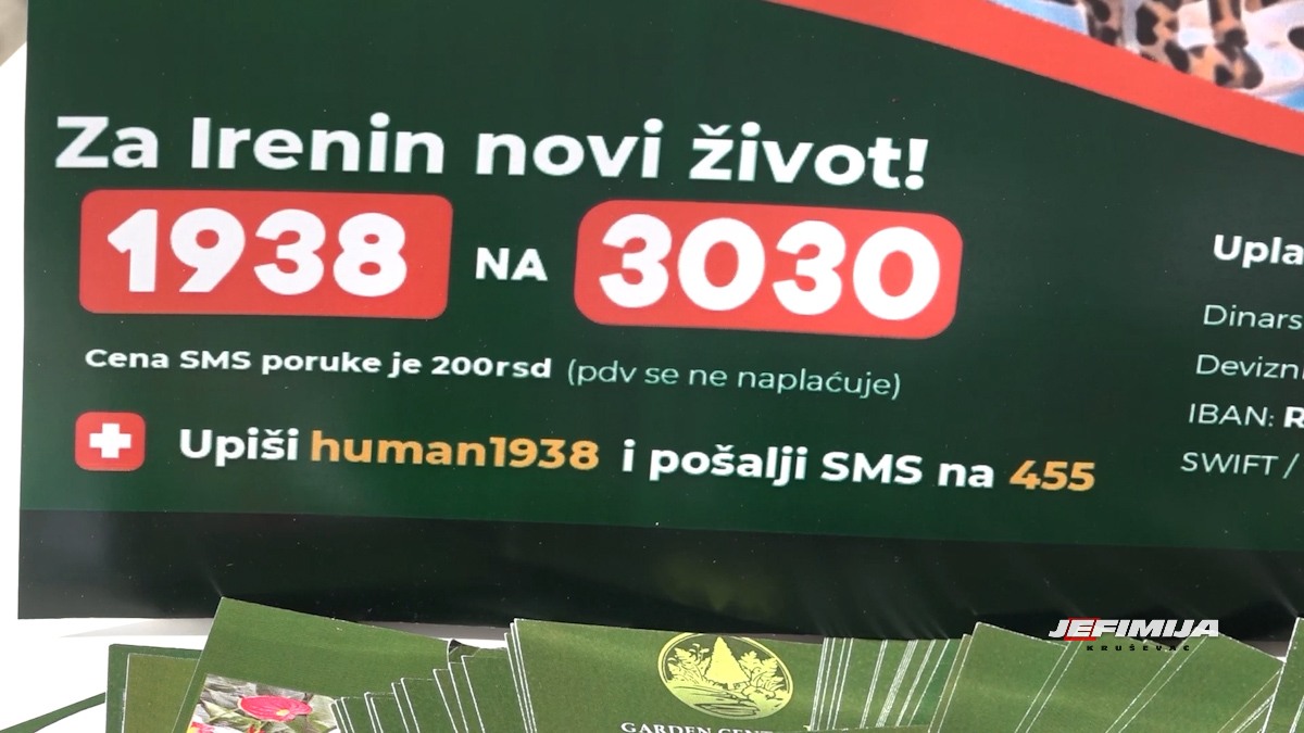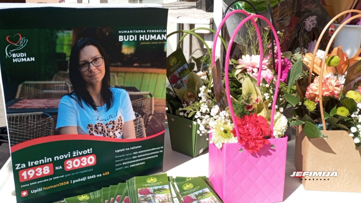 Udruženja Razvojni centar Srbije i Kreativa asteri pridružili su se akciji prikupljanja novčanih sredstava za Irenino lečenje i u nedelju, 15. marta na Trgu glumaca organizovaće prodajnu izložbu cveća, cvetnih anranžmana, ukrasnih predmeta i rukotvorina, a sav prihod od prodaje biće uplaćen na račun fondacije “Budi human” – za Irenin novi život.