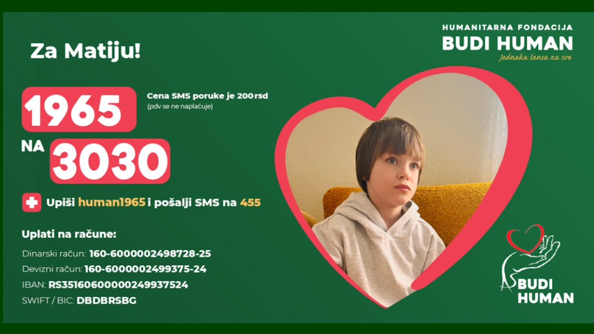 Matiji možete pomoći uplatom na dinarski račun: 160-6000002498728-25