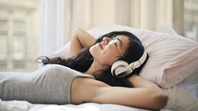 Fotografija: Devojka sluša muziku na krevetu – https://www.pexels.com/photo/woman-in-gray-tank-top-lying-on-bed-3807729/