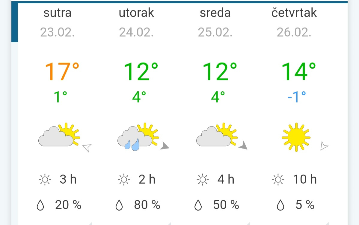 U Srbiji u četvrtak pretežno sunčano i toplije, povremeno uz umerenu oblačnost. Vetar slab i umeren, istočni i jugoistočni. Najniža temperatura od -1 do 5, a najviša od 11 do 17°C.