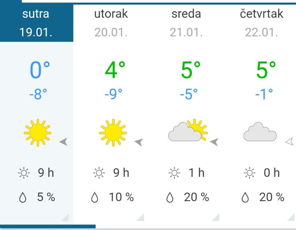 Prognoza vremena za period od 23. do 27. januara 2026. godine: U petak (23.01.) malo i umereno oblačno i malo toplije, a u toku dana južni i jugoistočni vetar u pojačanju, a u subotu (24.01.) uz nešto više oblačnosti, ali će se zadržati suvo. Od nedelje (25.01.) umereno do potpuno oblačno i još malo toplije, ponegde s kišom, a na visokim planinama sa slabim snegom. U košavskom području i u planinskim predelima vetrovito.