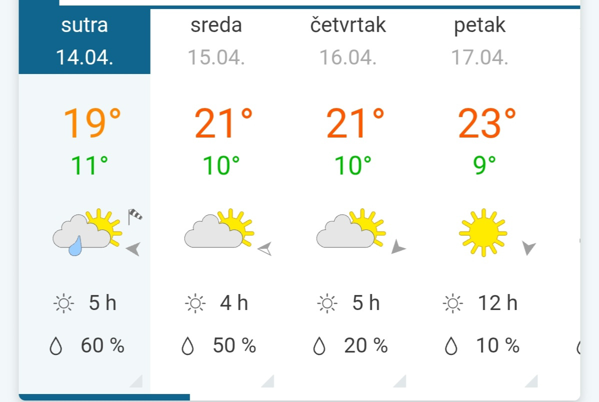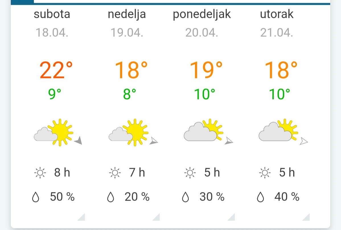 Prognoza vremena za Srbiju u periodu od 18. do 22. aprila 2026. godine: Promenljivo sa sunčanim intervalima i umereno toplo, početkom sledeće sedmice sa kišom i lokalnim pljuskovima sa grmljavinom.